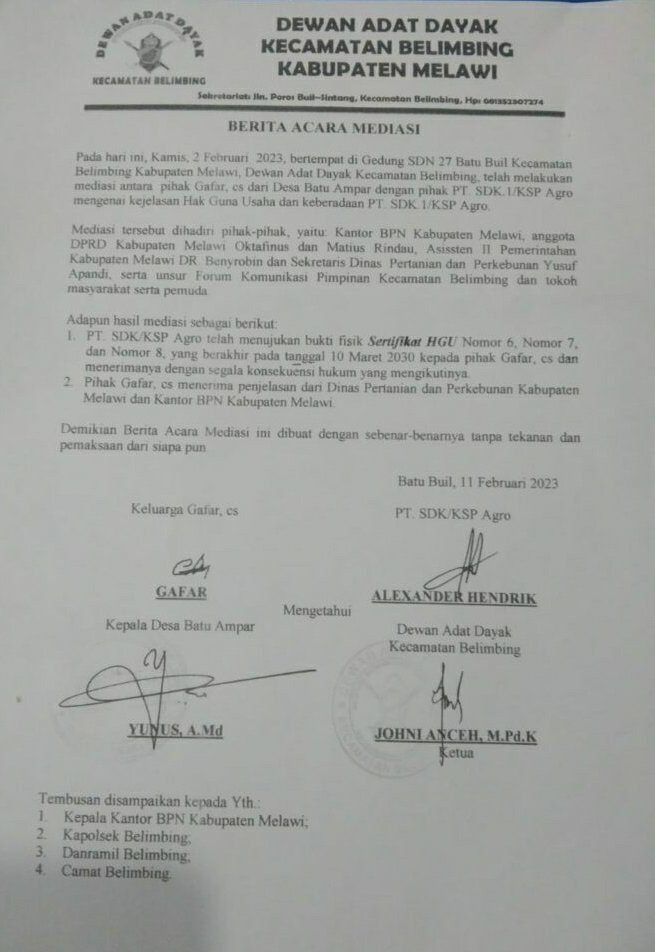 dalam Kesempatan ini Ketua DAD Belimbing Pertama dalam Membuka Mediasi Di Kediamannya Mengatakan”Kami pihak DAD hanya Memperlihatkan Bukti Salinan Fisik HGU perusahaan dan Menegaskan Sesusai Amanah SEKDA tidak boleh di perbanyak dan Di Unggah serta Foto Tanpa izin.Kemudian Ketua DAD Melanjutkan Bahwa Lembaga DAD Belimbing Sudah Berkerja keras untuk membantu Menegahi Permasalahan Mengenai Dan Mempertanyakan HGU perusahaan serta telah menunjukan fisik(bukti)salinan Berupa Sertifikat HGU dan tugas lembaga telah selesai dan selanjutnya diserahkan ke dua belah pihak lagi kedepannya.