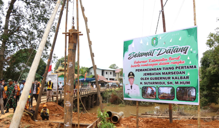 Kapuas Hulu, Kalbar- Usai menyerahkan bantuan sosial di Kantor Camat Semitau, Gubernur Kalimantan Barat H. Sutarmidji, S.H., M.Hum., menyaksikan secara langsung pemancangan tiang pertama pembangunan Jembatan Sungai Marsedan, Minggu (12/3/2023).