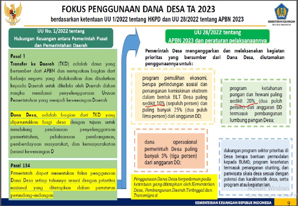 Hal ini tertuang dalam Peraturan Menteri Keuangan Republik Indonesia Nomor 201/PMK.07/2022 tentang Pengelolaan Dana Desa 2023. Dan Ketahanan Pangan juga diatur dalam peraturan Menteri Desa PDTT nomor 8 tahun 2022 tentang Prioritas penggunaan Dana Desa tahun anggaran 2023.