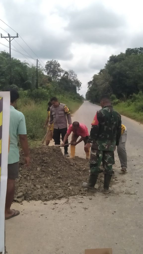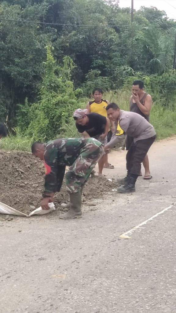 Berandanews24,Kalbar,Melawi-,Dipimpin langsung oleh Bhabinkatibmas dan Bahbinsa bersama-sama masyarakatDesa Batu Nanta dan Cv.Mitra Persada melaksanakan menutupi jalan berlubang di wilayah Di Poros Jalan Provensi Sintang-Pinoh,tepatnya di Poros Desa Batu Nanta kecamatan Belimbing Kab.Melawi KALBAR