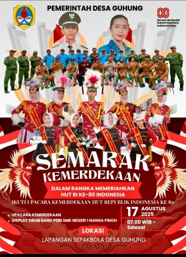 Segenap dan seluruh Warga Desa Guhung yg tdk dpt Kami sebutkan satu persatu,Tanpa mengurangi rasa hormat Kami Kepada Bpk/Ibu sekalian.Menginformasikan Kepada warga semua yg tergabung Desa Guhung,BAHWA PELAKSANAAN UPACARA pada 17 -8-2025 Pada hari Minggu.”Kita di Meriahkan dgn Hadirnya GRUP DRUM BAND dari SMK NEDERI 1 Nanga Pinoh”Jadi Kami Menghimbau dan mengajak seluruh warga Desa Guhung UNTUK MEMERIAHKAN DAN HADIR UTK MENGIKUTI PELAKSANAAN UPACARA BENDERA,Atas perhatiannya Kami Ucapkan Terimakasih,”ucap Babinsa Koramil 1205/16 (Ello) kemudian Babinsa Menambahkan”Dengan Semarak Kemerdekaan kita sebagai warga kita wajib menghormati perjuangan para Pahlawan yg telah berjuang demi Bangsa Indonesia.”Imbuhnya”