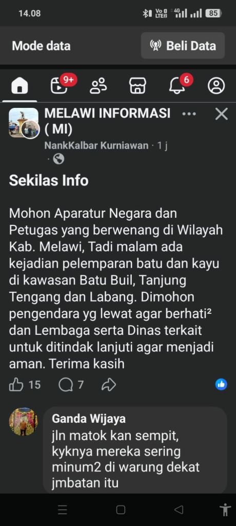 “Mohon Aparatur Negara dan Petugas yang berwenang di Wilayah Kab Melawi, tadi malam ada kejadian pelemparan batu dan kayu di kawasan Batu Buil, Tanjung Tengang dan Labang. Dimohon pengendara yang lewat agar berhati-hati dan lembaga serta dinas terkait untuk ditindaklanjuti agar menjadi aman. Terima kasih.”